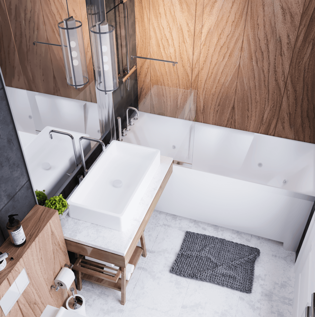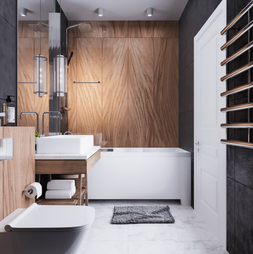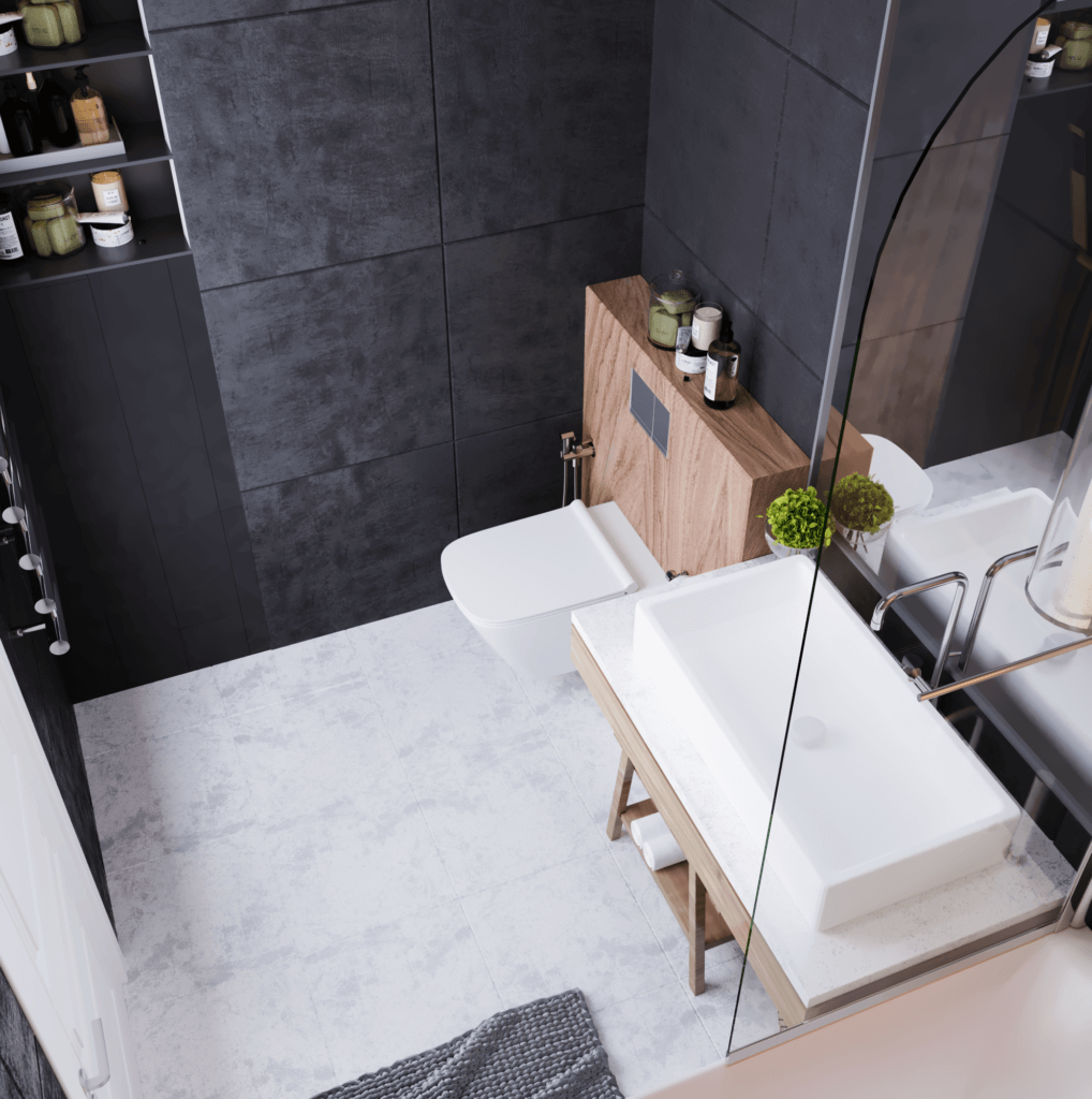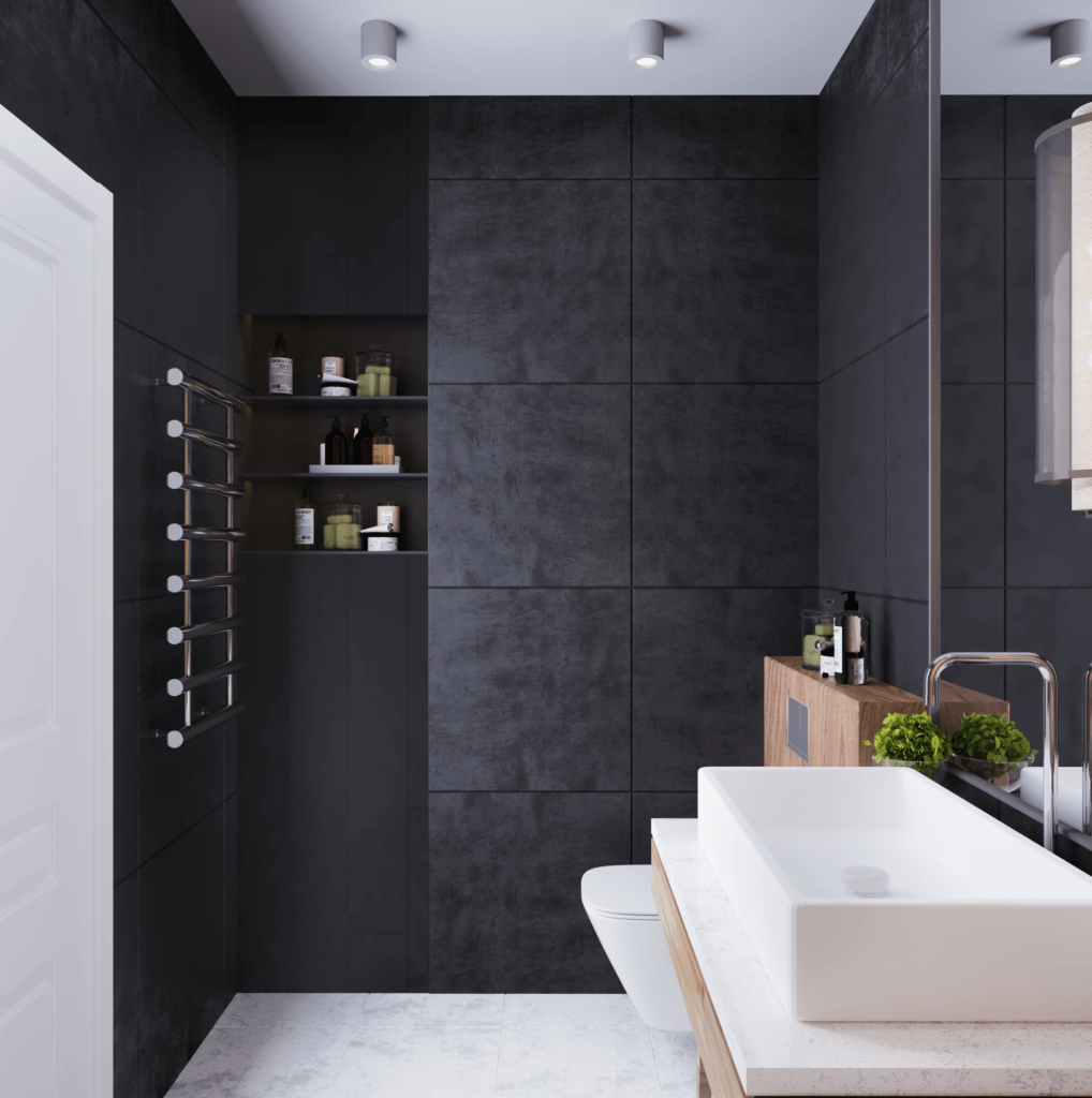 Санузел в тёмных тонах ЖК «ATLANT», г. Алматы