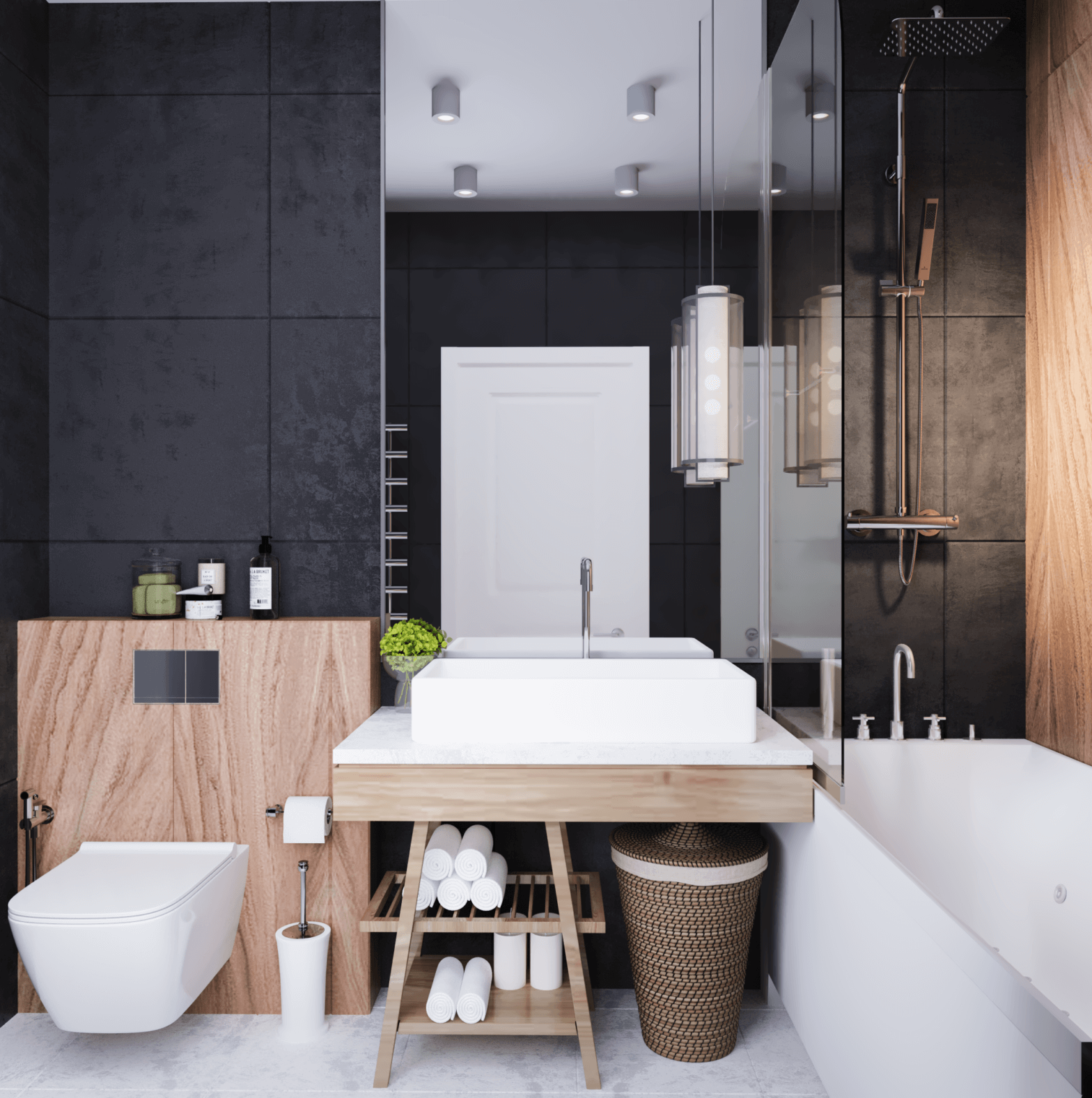 Санузел в тёмных тонах ЖК «ATLANT», г. Алматы