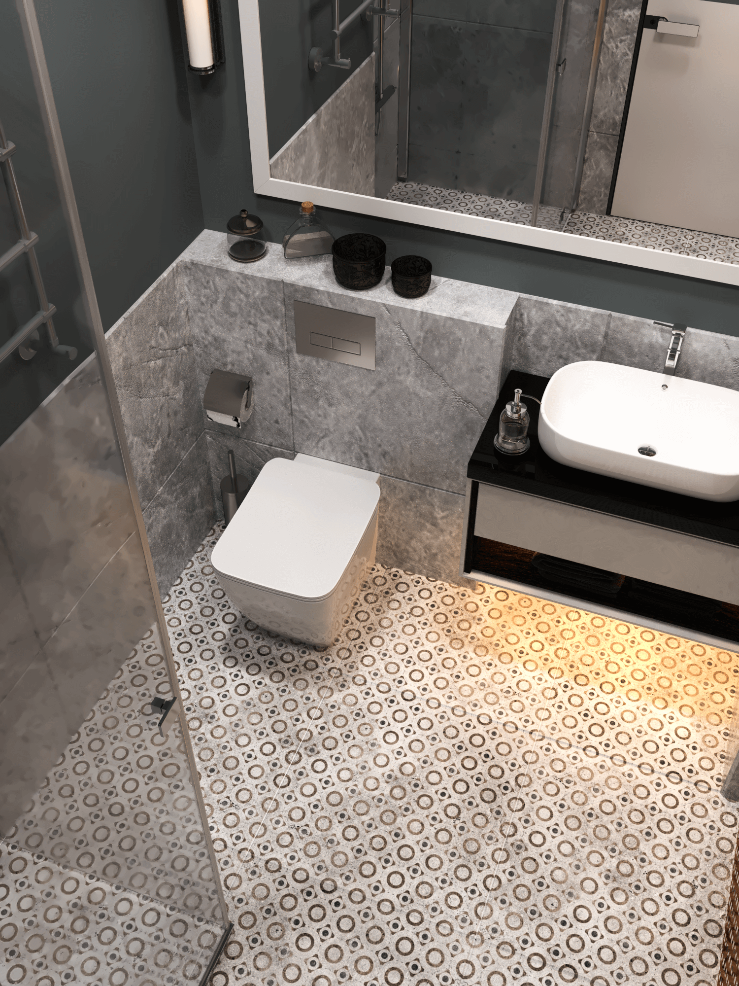 Санузел в тёмных тонах ЖК «ATLANT», г. Алматы
